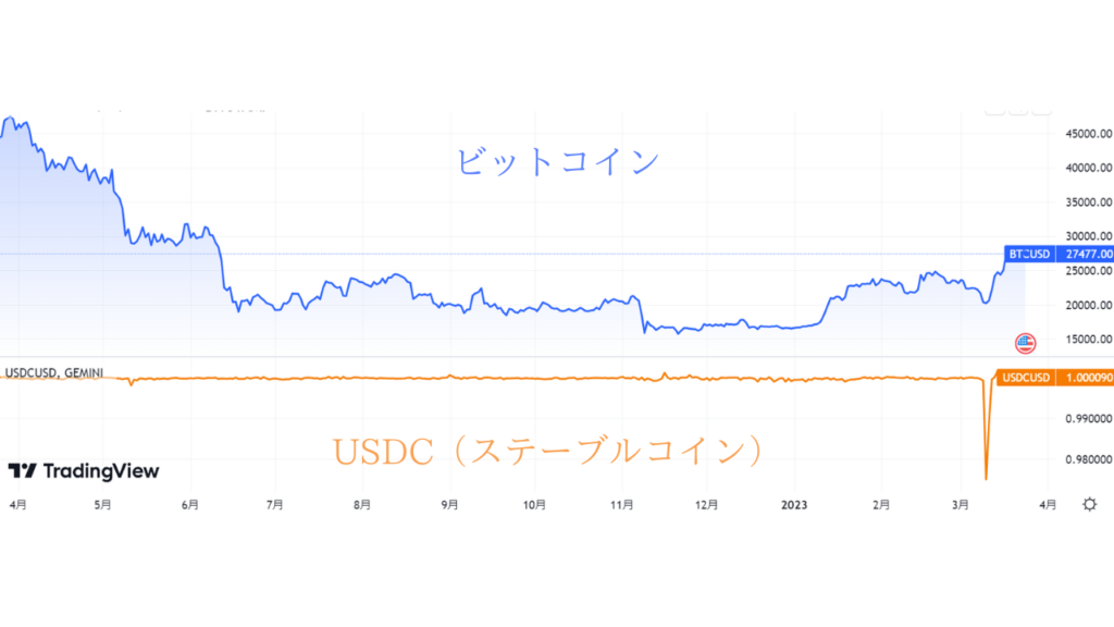 上記の比較図をみると、ステーブルコインであるUSDCの価格は常に1ドル付近に留まっており、ビットコインと比較して価格変動の幅が非常に狭いことが分かります。