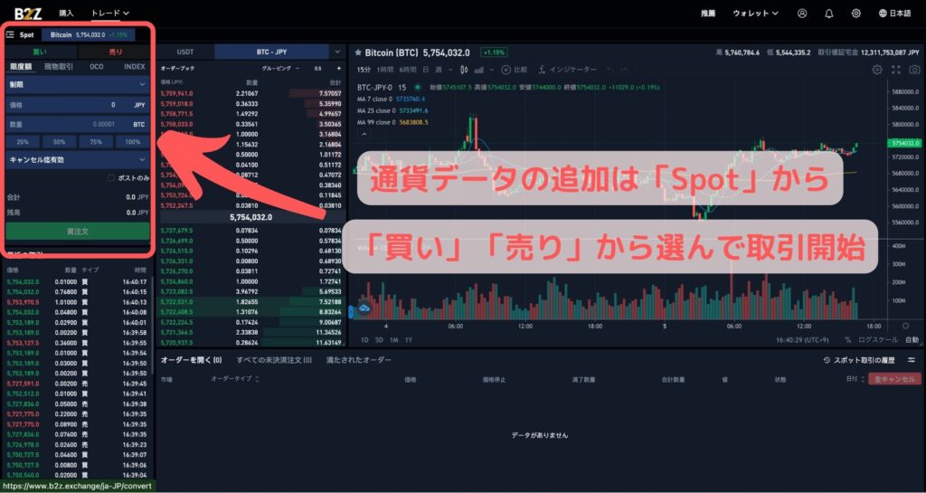 スポット取引の、オーダーブック画面が表示されます。